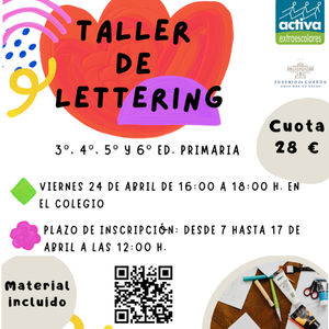 ACTIVA presenta un TALLER DE LETTERING dirigido a alumnado de 3º a 6º de Primaria, a realizar el viernes 24 de abril en el cole, donde podrán iniciarse en el arte de dibujar letras de forma creativa. En una sesión de dos horas, aprenderán técnicas básicas, experimentarán con distintos estilos y desarrollarán su creatividad. El precio del taller es de 28 €, con todos los materiales incluidos.